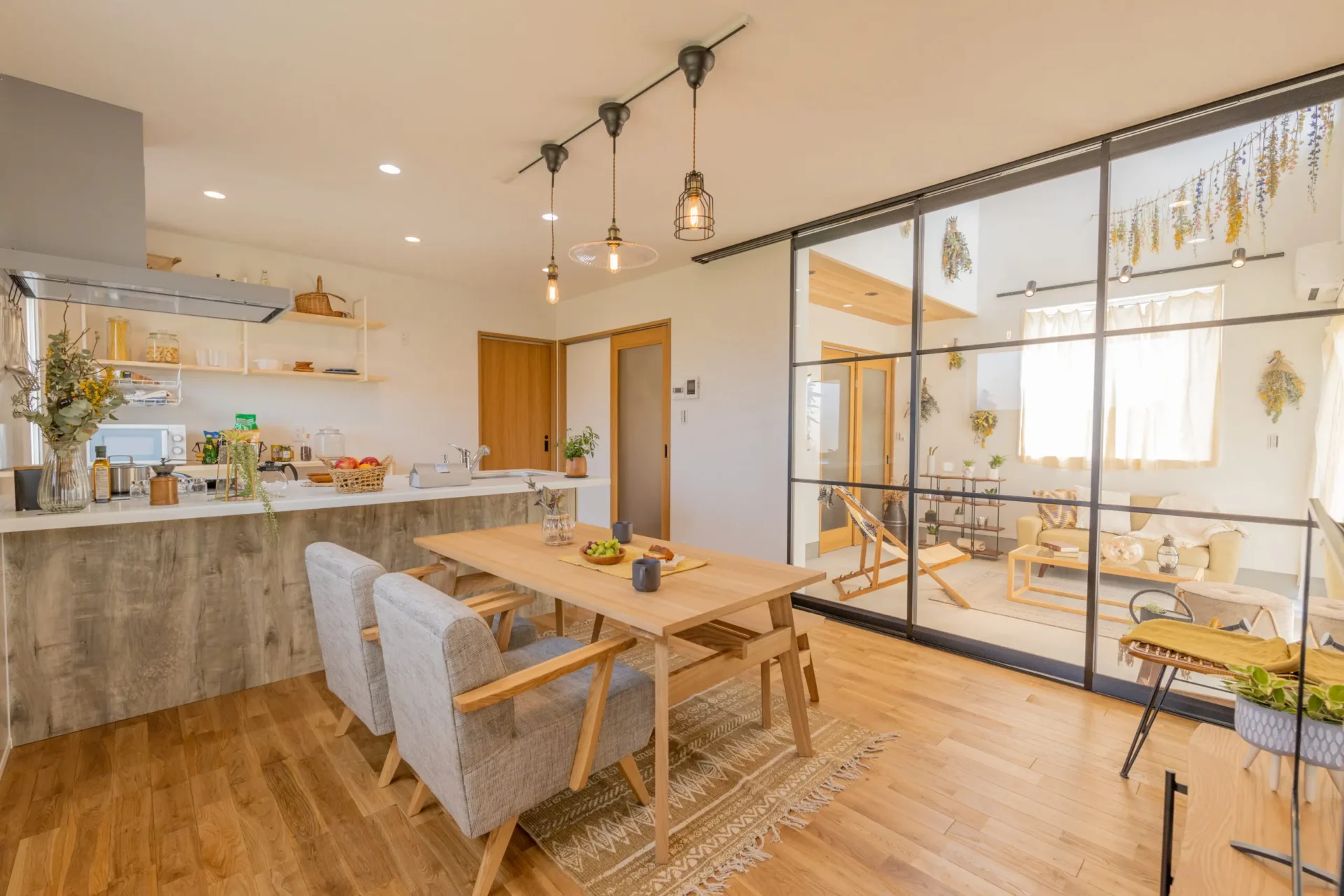 大きなガラス窓から土間リビングへの