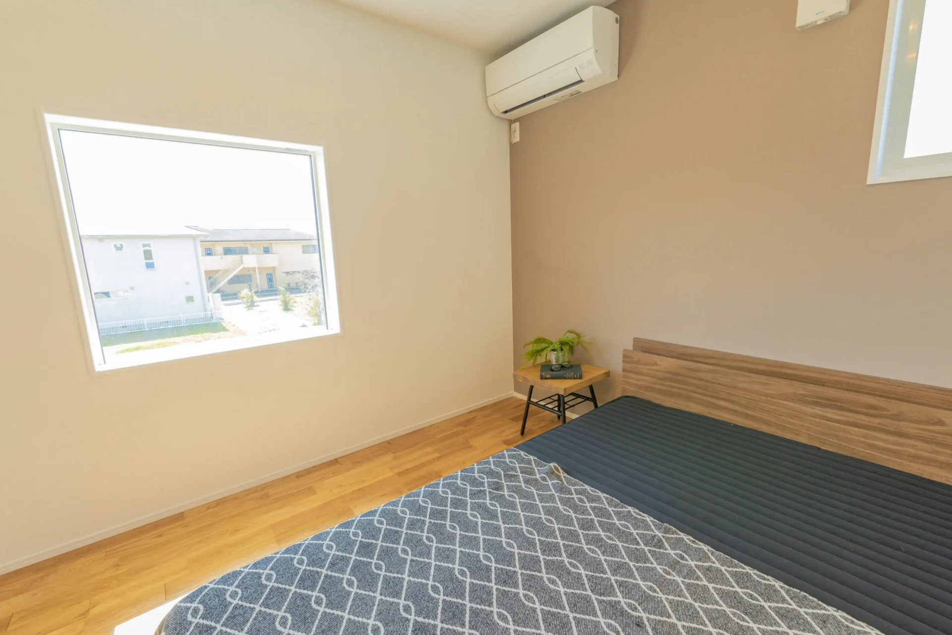 窓から光が差し込む、落ち着いた寝室