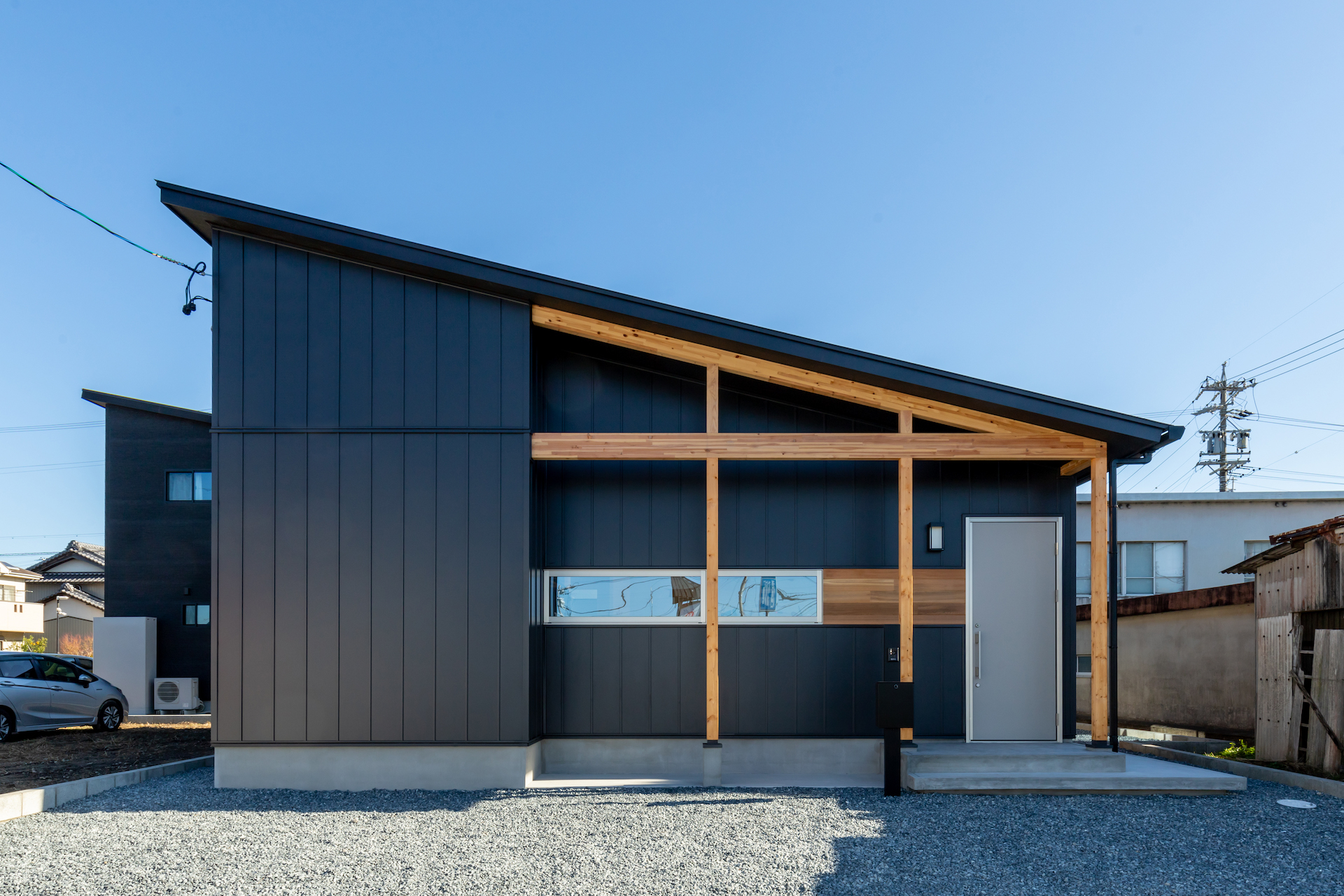 シャープな印象の片流れ屋根に化粧柱がアクセントに効いた外観