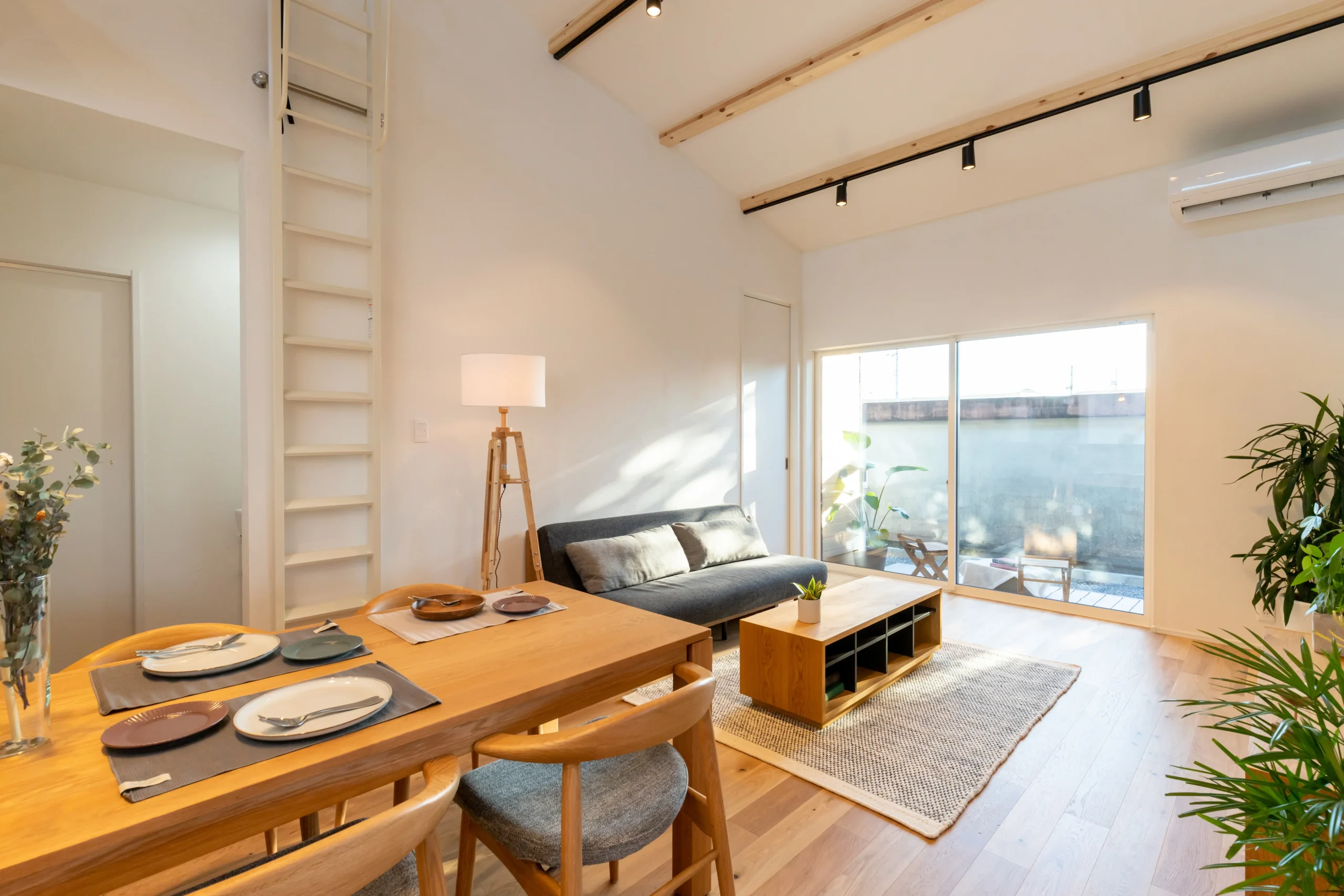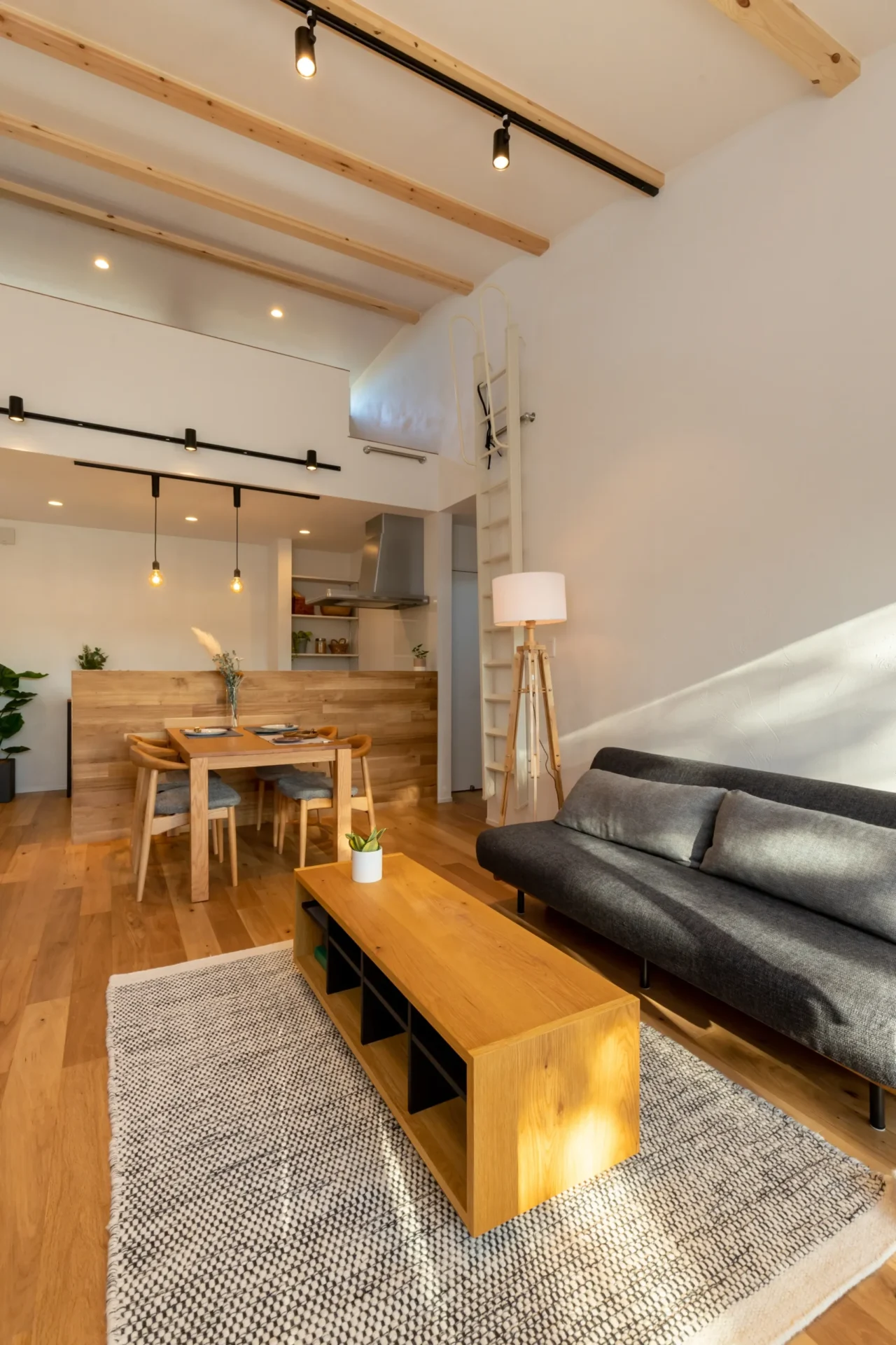 フローリングや腰壁、駆体現しの梁に木材をふんだんに使った室内。