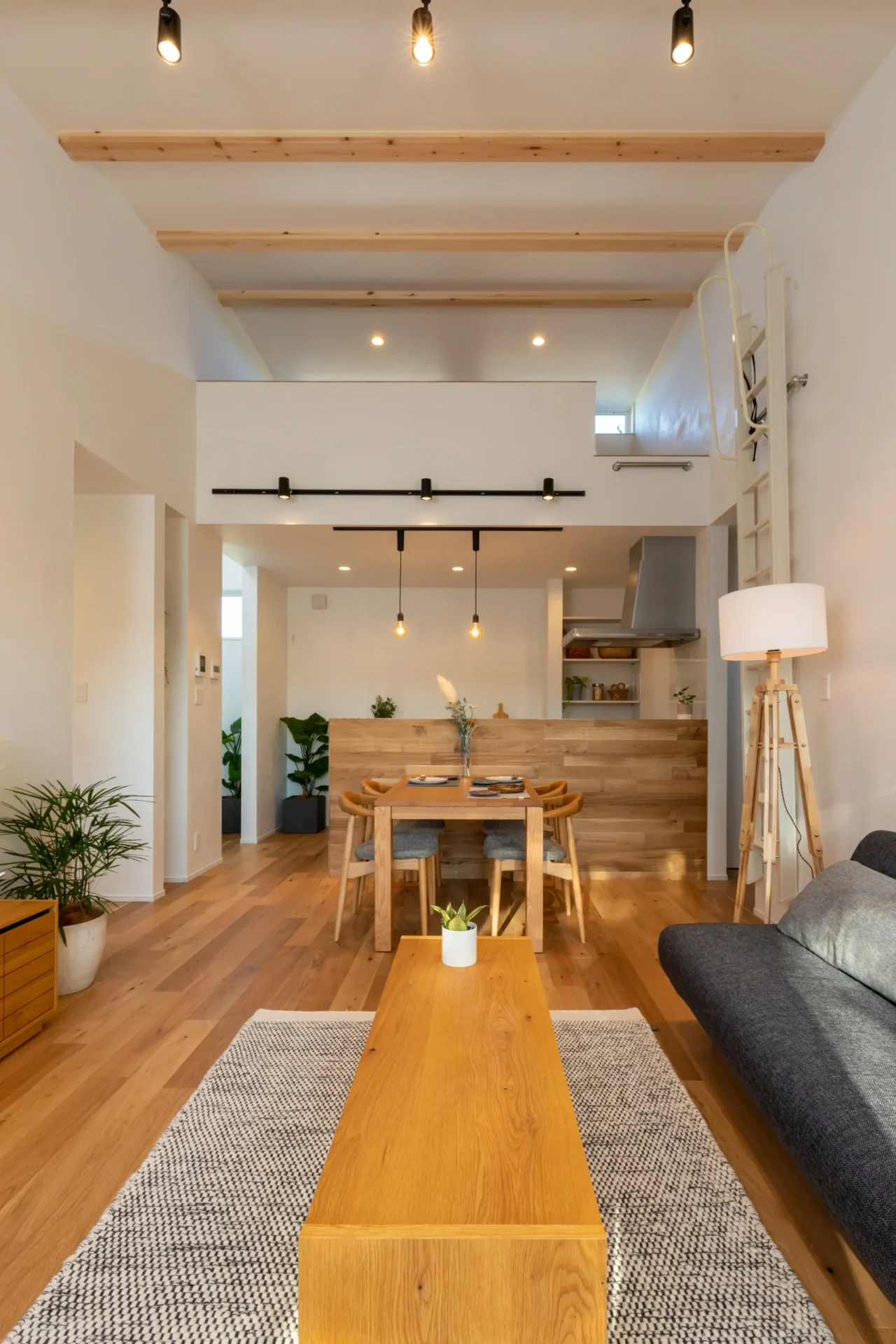 屋根の勾配に沿って高さを出して、ロフトへつながる勾配天井